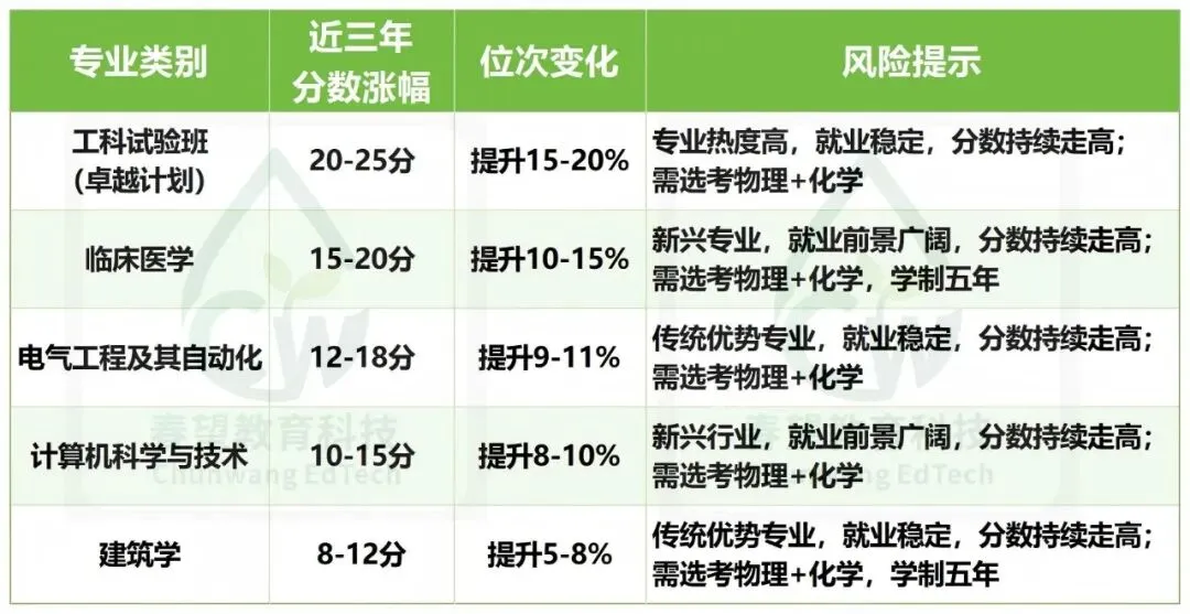 - o首选工科试验班(卓越计划),次选临床医学、电气工程及其自动化、计算机科学与技术,瞄准高端装备制造、生物医药、电子信息等领域核心岗位