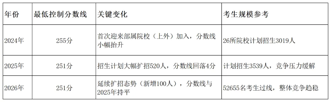 近三年最低控制分数线呈现“稳中有降”趋势,2025-2026年稳定在251分,这与招生计划的持续扩大直接相关(2024-2026年计划招生数从3019人增至3639人)。对考生而言,“过线”难度有所降低,但热门院校专业的竞争门槛依然居高不下。