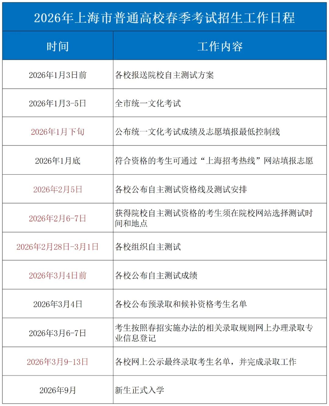 2026年上海市普通高校春季考试招生采用“统一文化考试+院校自主测试”的招生模式。考生统一文化考试成绩总分(含政策性加分)须达到志愿填报最低成绩控制线,其中应届高中毕业考生还须取得思想政治、历史、地理、物理、化学、生物学、信息技术7门科目高中学业水平合格性考试的全部合格成绩,方有资格参加春考志愿填报。