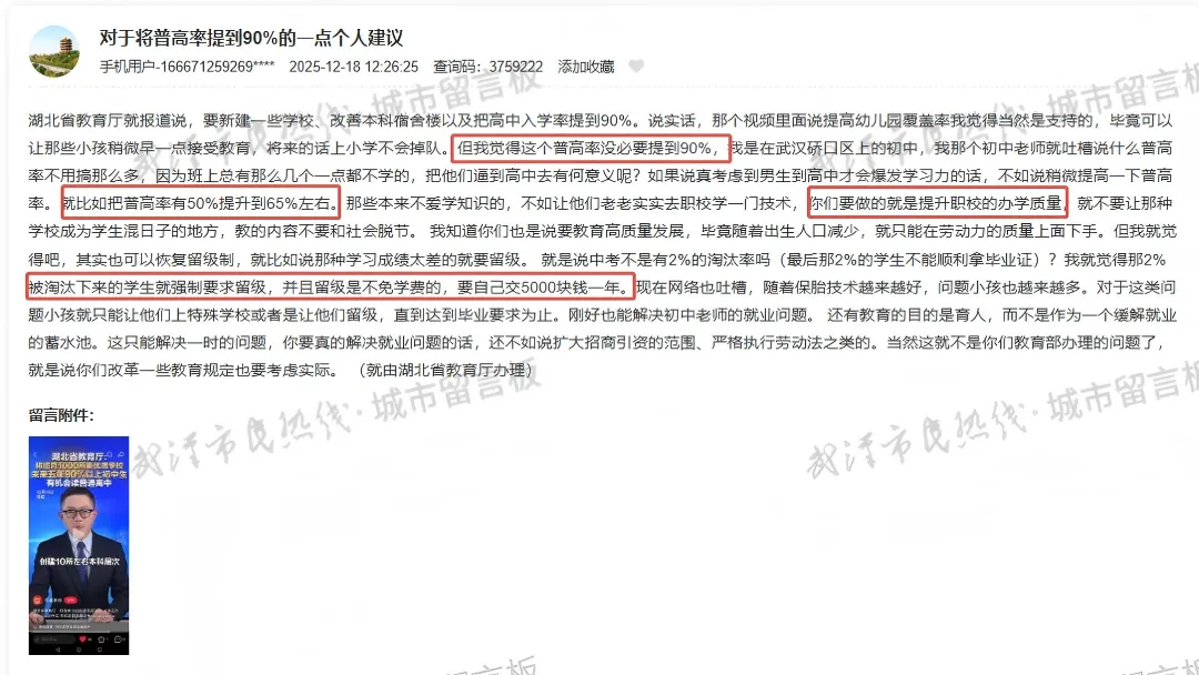 提高普高率是为回应群众对子女接受普高教育的强烈需求