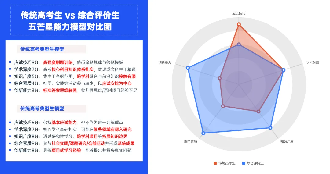 综合评价生:呈现更均衡的“五边形”特征,尤其在综合素质与创新能力维度优势明显