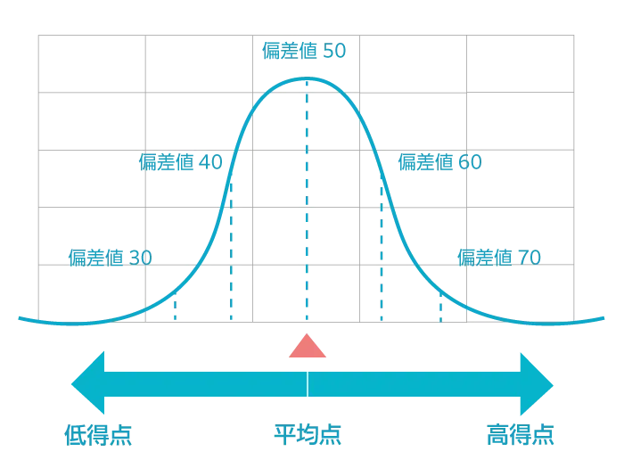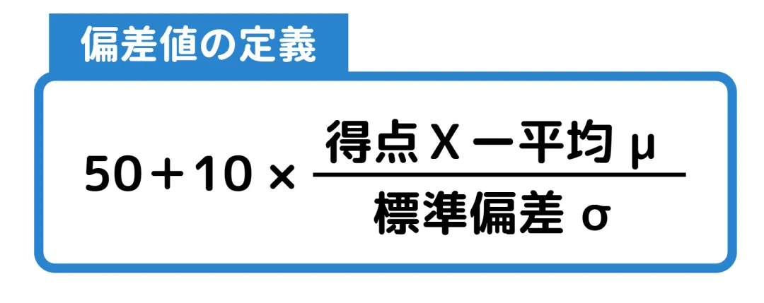 偏差値=10×(個人の得点―平均点)÷ 標準偏差+50