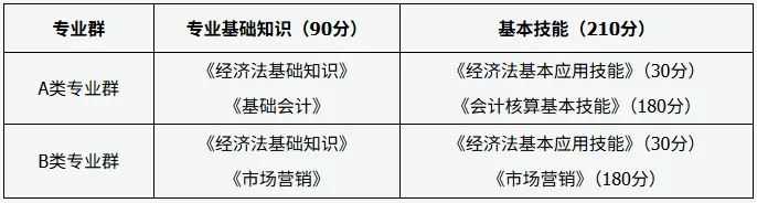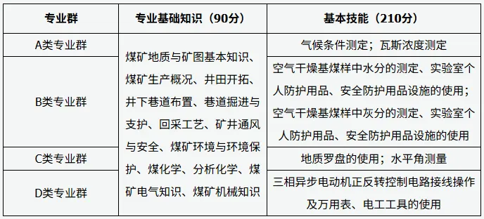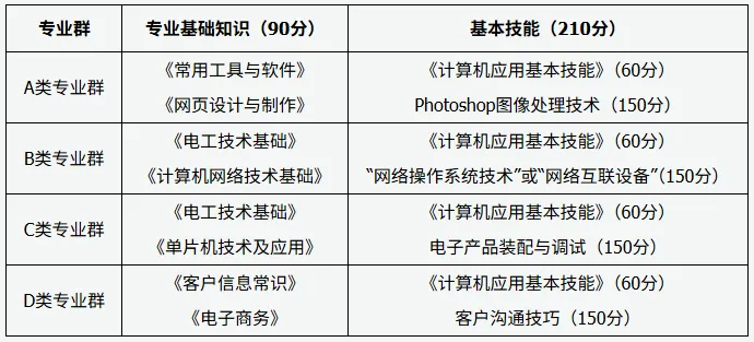 专业基础知识考试采用机试办法,考试时间60分钟;基本技能考试办法如下:A类、B类专业群为机试,考试时间120分钟C类专业群为机试和现场操作测试,考试时间120分钟;D类专业群为机试和现场面试,考试时间120分钟。