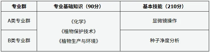 专业基础知识考试采用机试办法,考试时间60分钟;基本技能考试为现场操作测试,采用手工操作、设备操作形式考试时间40分钟,A类专业群考试项目为显微镜操作B类专业群考试项目为种子净度分析