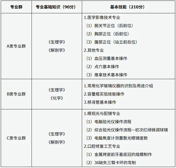 医学影像技术专业考生从腕关节正位后前位、胸部正位(后前位)、腹部正位(站立前后位)三项中抽取一项进行操作考核;其他专业考生从血压测量基本操作、点穴基本操作、推拿技术基本操作三项中抽取一项进行操作考核。