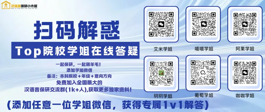 在“保研小木屋”全学科体系中,「汉语言保研小木屋」是诞生最早、最垂直、专业化程度最高的旗舰品牌。由北大、北师、复旦学姐创办,以“传承经验、传递成功”为使命,通过顶级学府导师打破国内中国语言文学类保研信息资源不对称现状。我们致力于长远的发展,为同学们提供精准专业指导、综合面试培训、以及学术指导等。目前新媒体的累计阅读量突破230w+,保过同学offer1500+,全国各大名校中都有木屋er的身影。我们始终聚焦中国语言文学保研,是目前全网最垂直最有实力的保研工作室!