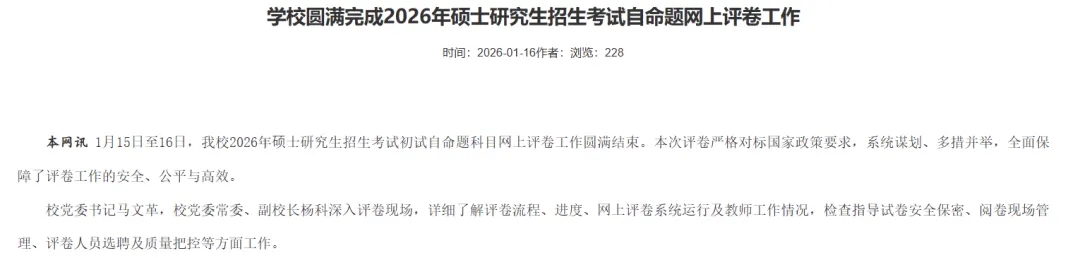 1月16日,安徽建筑大学研究生院发文:学校圆满完成2026年硕士研究生招生考试自命题网上评卷工作。
