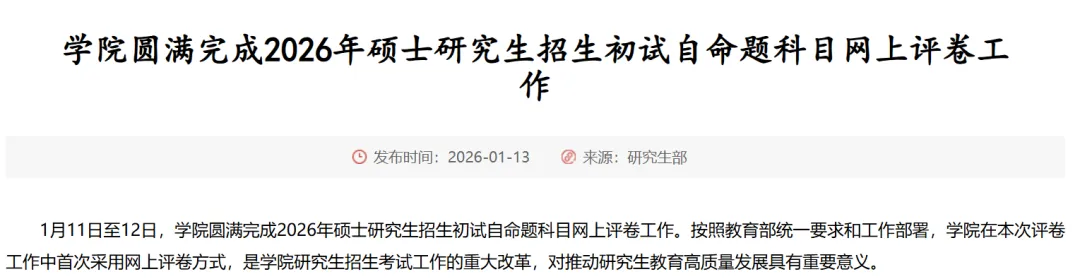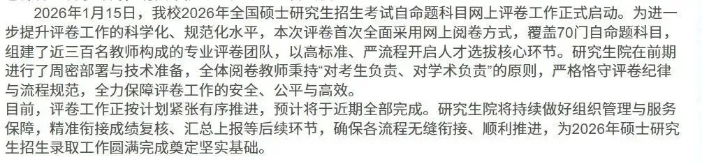 1月17日,2026年硕士研究生招生考试自命题科目网上阅卷,评卷工作正按计划紧张有序推进,预计将于近期全部完成。