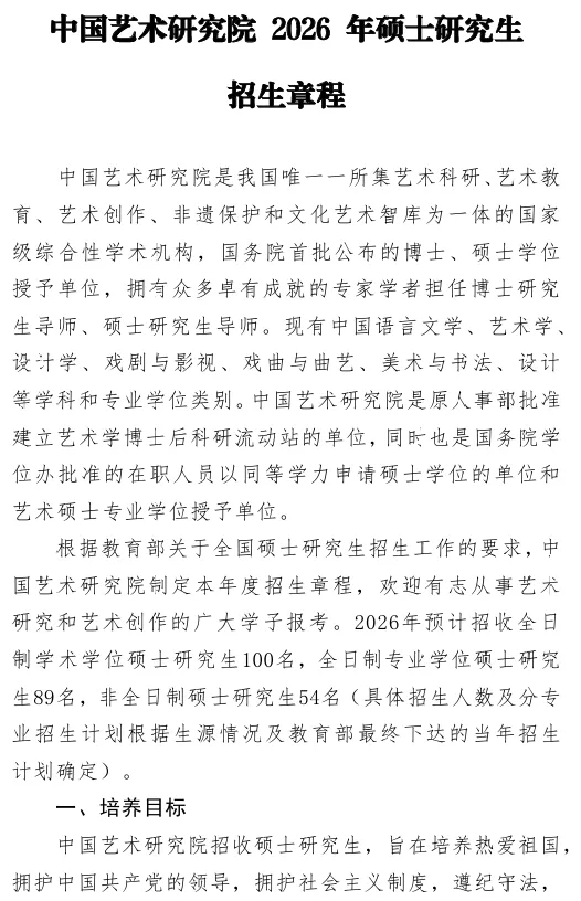 中国艺术研究院是我国唯一一所集艺术科研、艺术教 育、艺术创作、非遗保护和文化艺术智库为一体的国家 级综合性学术机构,国务院首批公布的博士、硕士学位 授予单位,拥有众多卓有成就的专家学者担任博士研究 生导师、硕士研究生导师。现有中国语言文学、艺术学、 设计学、戏剧与影视、戏曲与曲艺、美术与书法、设计 等学科和专业学位类别。中国艺术研究院是原人事部批准 建立艺术学博士后科研流动站的单位,同时也是国务院学 位办批准的在职人员以同等学力申请硕士学位的单位和 艺术硕士专业学位授予单位。
