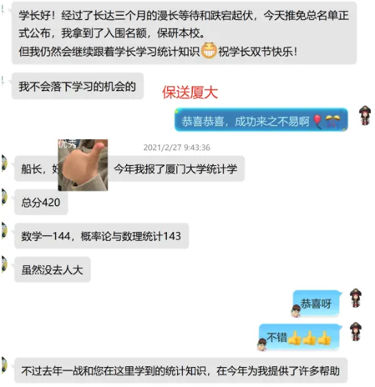 我们做到了人大应统&人大流统&人大大数据学院应统&人大统计学硕录取同学70%~80%以上来自硕果计划!中财应统、贸大应统录取同学30%~40%以上来自硕果计划!北师应统硕果复试录取率87%以上,且每年均有初试总分Top学员!历年也帮助部分同学上岸厦大统计!