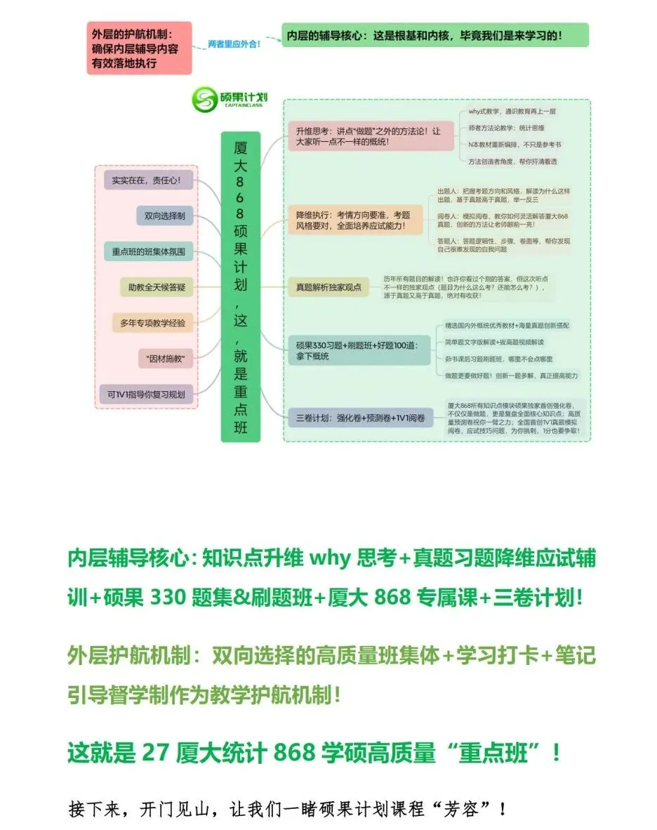 船长学长领衔排名第一的人大统计硕博团队及985高校统计出身组成的硕果计划考研师资团队,随着辅导知名度的提升,越来越多考外校的同学开始咨询学长,是否有其他对应院校的辅导。因此,我们正式面向厦大统计868学硕考研提供了全新的27硕果计划厦大统计868学硕版。硕果计划学长学姐团队(厦大868学硕版师资团队由师长老师主导,硕果高分上岸学长学姐答疑团队组成),依旧秉持着每一年都不断精进打磨课程,27厦大统计868学硕硕果计划依然有着诸多亮点,其中最大的亮点在于结合团队10+年考研辅导经验推出“里应外合”的教学模式: