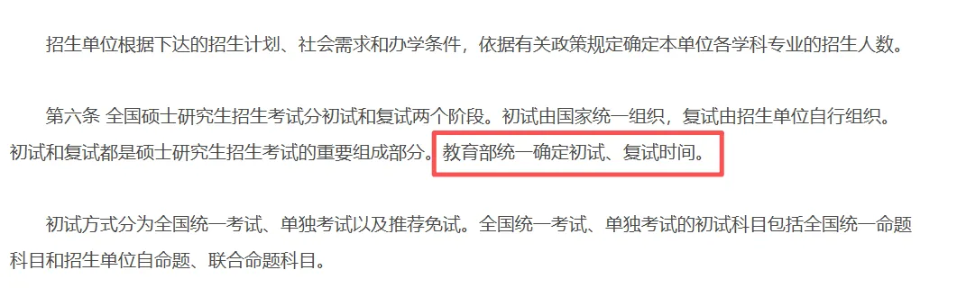 教育部在《2026年全国硕士研究生招生工作管理规定》中明确指出:教育部统一确定初试、复试时间。