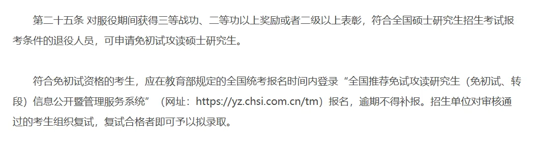 教育部在《2026年全国硕士研究生招生工作管理规定》中,以往符合免初试资格的只有在部队荣立二等功以上的退役人员,今年这一范围得到了扩展,增加了对服役期间获得三等战功的退役人员的免初试攻读硕士研究生的资格。