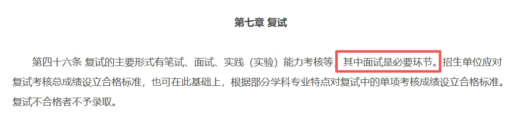 教育部在《2026年全国硕士研究生招生工作管理规定》中明确指出:复试的主要形式有笔试、面试、实践(实验)能力考核等,其中面试是必要环节。