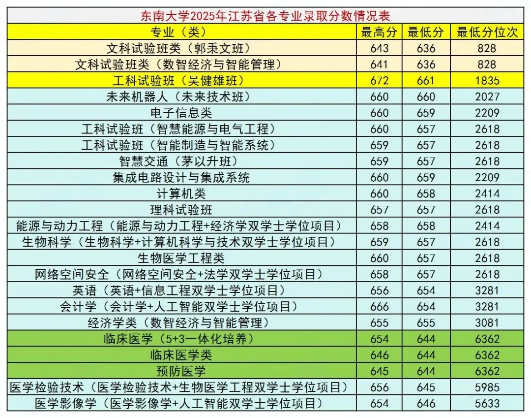 东南大学2025年各专业录取分数线简析:吴健雄班最高(近两年江苏省对比)