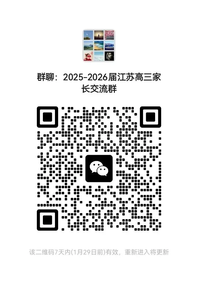 更多高考资讯可进“2025—2026届江苏高三家长群”了解,群内会第一时间发布江苏省最新高考信息,并有专业老师讲解,及时答疑解惑,有问必答,帮您理清各项政策细节,把握一切机会。非诚勿扰。