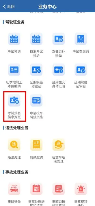 2.点击驾驶证业务栏的【考试报名信息变更】。