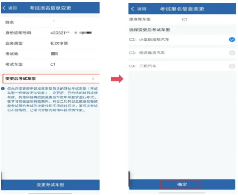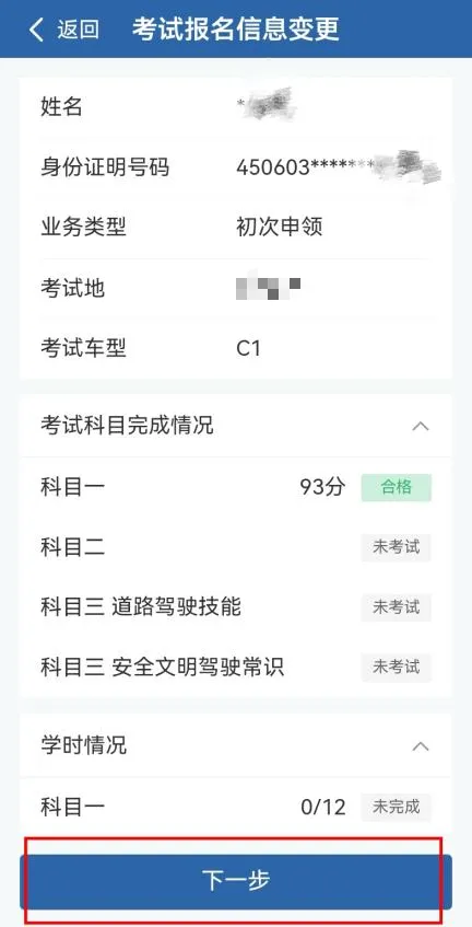 3.核对信息后点击【下一步】→选择【变更考试车型】。