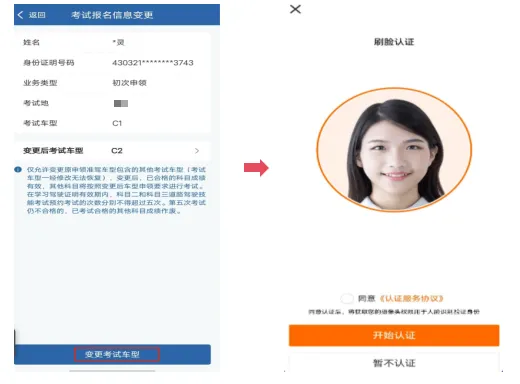 5.点击【变更考试车型】进行人脸认证,认证通过后,提交即可。