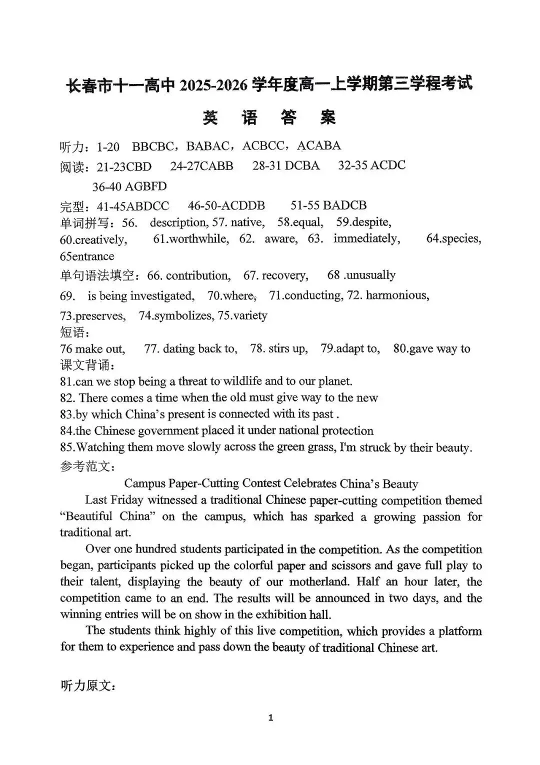 长春十一高2026年1月高一上期末考试化学试题及答案下载