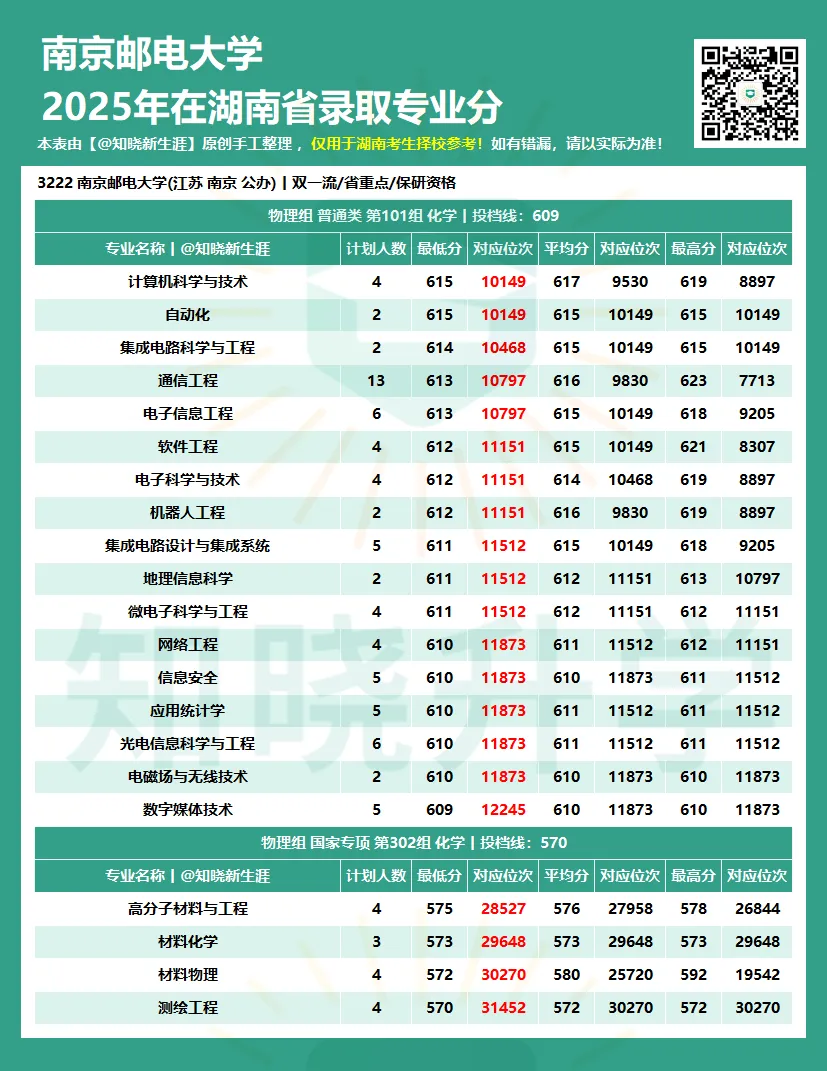 专业分丨南京邮电大学2025年在湖南省专业录取分数线(含位次)