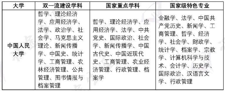 王牌专业:马克思主义理论、理论经济学、应用经济学、社会学、法学、中国语言文学、新闻传播学、统计学、工商管理学、农林经济管理、公共管理学、哲学、政治学、中国史、信息资源管理、计算机科学与技术、外国语言文学等。