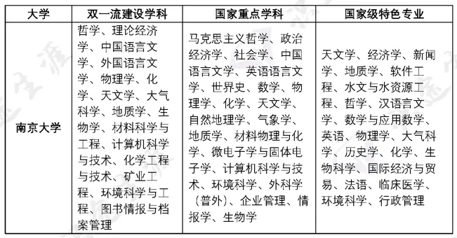 王牌专业:哲学、应用经济学、政治学、社会学、马克思主义理论、心理学、中国语言文学、外国语言文学、考古学、中国史、世界史、数学、物理学、化学、天文学、地理学、大气科学、生物学、统计学、力学、计算机科学与技术、软件工程、基础医学、临床医学、口腔医学、公共卫生与预防医学、药学、护理学、工商管理、公共管理、艺术学理论、理论经济学、法学、生态学、电子科学技术教育学、新闻传播学、材料科学与工程、信息与通信工程、测绘学科与技术、核科学与技术、环境科学与工程、生物医学工程、农林经济管理、图书情报与档案管理、地球地理学、科学技术史、中西医结合、地质学、医学技术等。