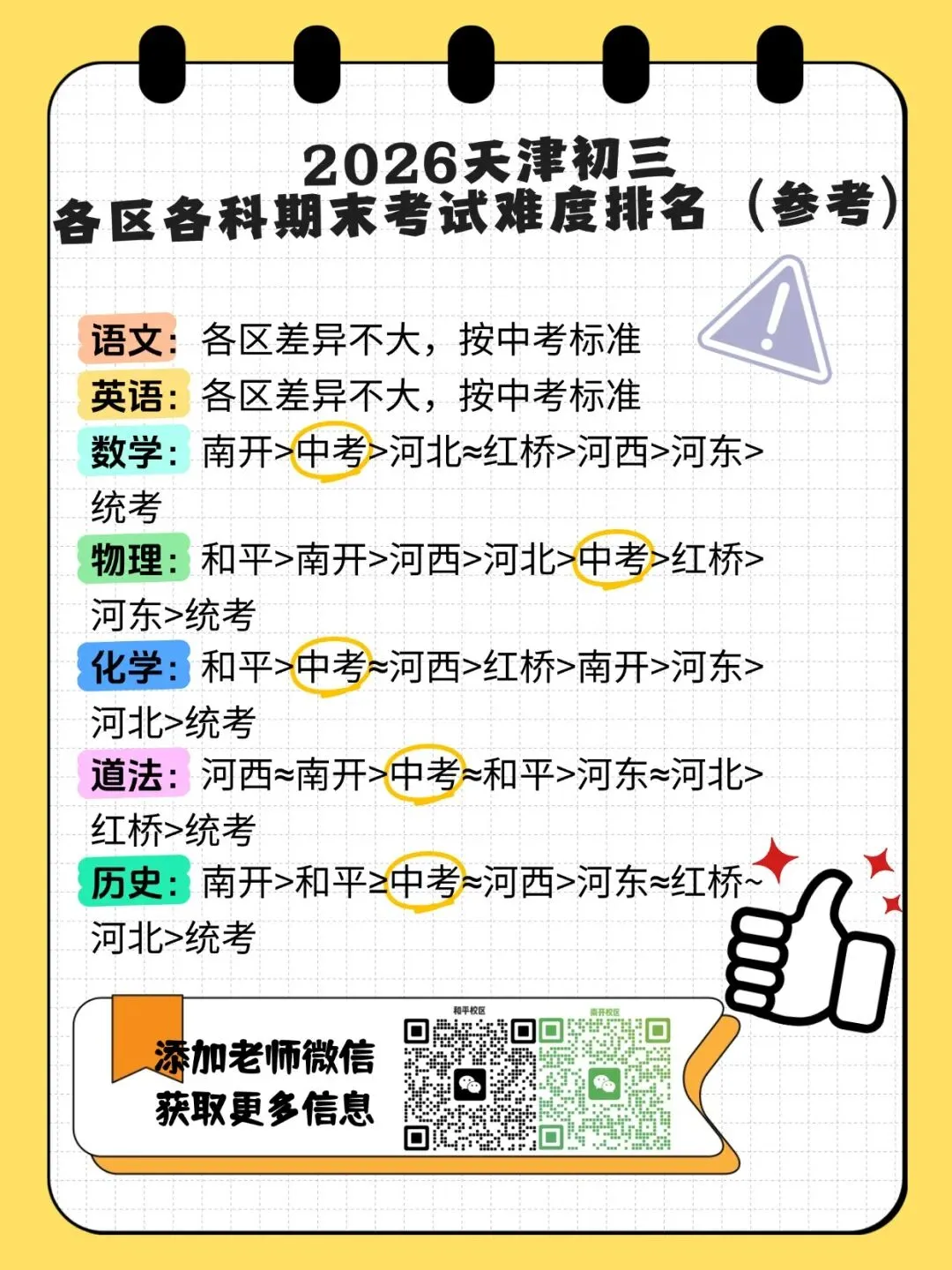 1.和平、南开两区在多数科目上被视为“高难度”或“拔高”区,尤其数学、物理、化学、历史等学科。这符合两区教育强区的传统印象。