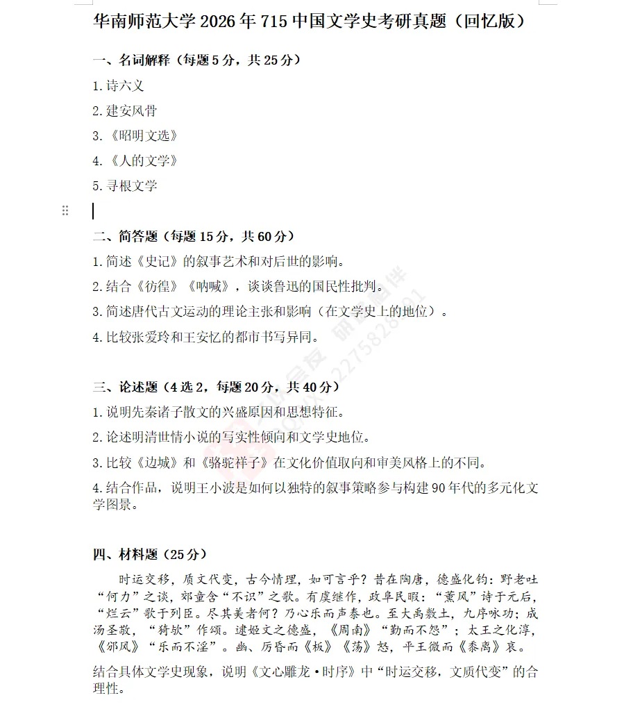 最后,26年材料题出自《文心雕龙·时序》,要求考生结合具体文学史现象,说明“时运交移,文质代变”的合理性,该题体现文学史与文论的结合,建议考生在复习中国文学史的同时,打通与古代文学批评史的学科壁垒。