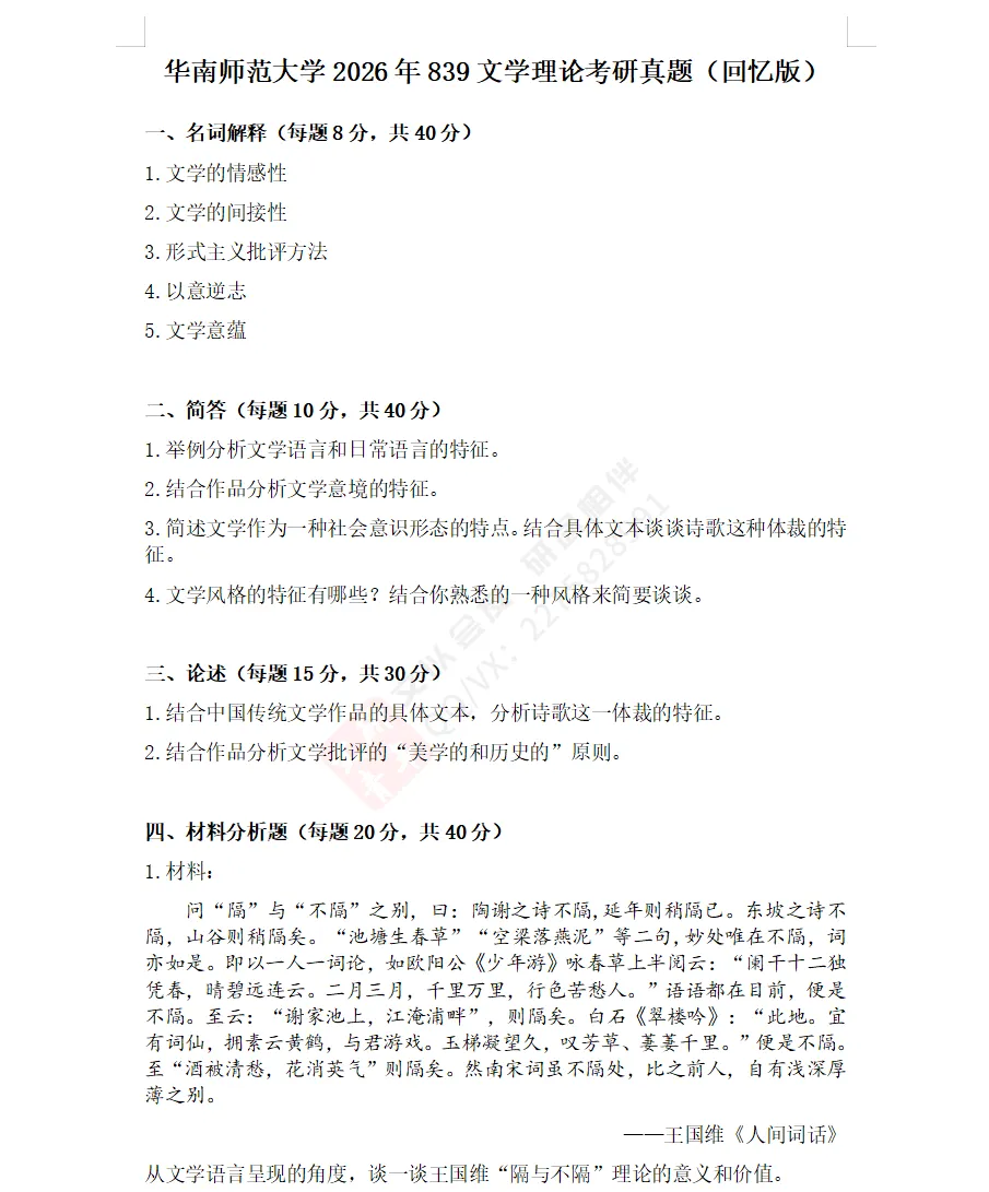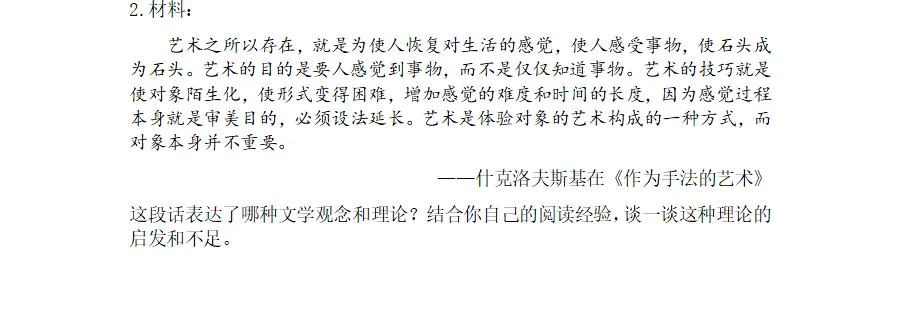 2026年839文学理论最大的变化在于材料题增至两道,一道考查王国维《人间词话》(“隔与不隔”),另一道考查什克洛夫斯基(“陌生化”),这些都是中西文论史上的常规重点,没有偏、难、怪的概念范畴。但第二道材料题要求考生“结合阅读经验,谈一谈这种理论的启发和不足”,这意味着考生应持有批判性思维,并以此切入答题,既要明白理论的价值与意义,也要看到理论的局限性,最好能将俄国形式主义文论置于20世纪西方文论史脉络上进行作答。