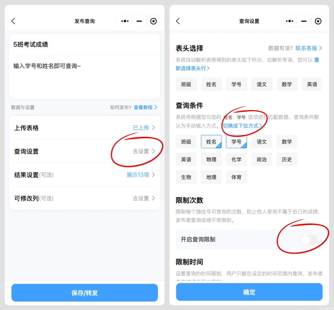 上传完表格后,点击去设置按钮,查询选项是根据成绩表格的表头识别出多种选项,比如:姓名、学号、班级等等。老师根据需求选择一项或者多项作为查询条件,这里选择的是姓名和学号。