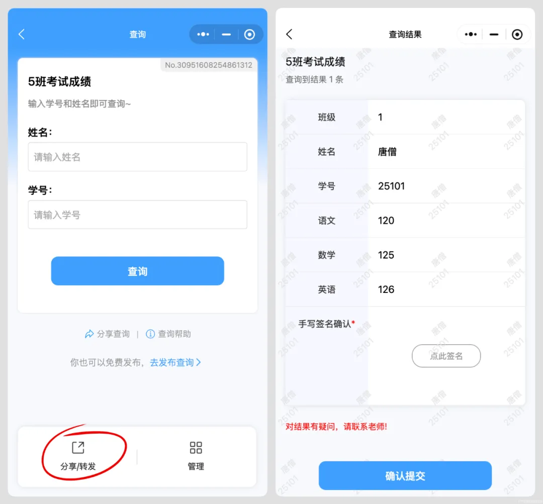 家长扫码或者点查询链接,输对孩子的信息就能查到成绩。家长自己动手查询,保证每人只能看到自己孩子的成绩,这样发成绩又快又安全。