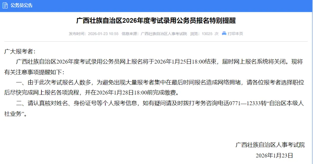 报名倒计时!广西壮族自治区2026年度考试录用公务员报名最后一天了