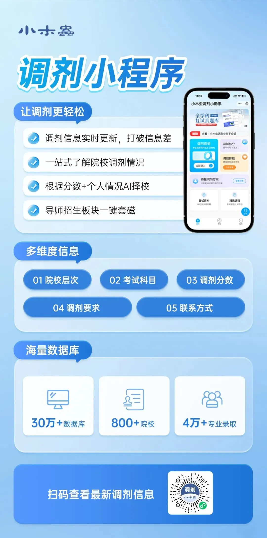 最难的就是收集调剂信息,因为调剂信息差,每年都会有很多考生没能成功调剂,或者选择一所更合适的调剂。小程序的作用,就是打破信息壁垒,助力应届考生“快、准、新、全”获取一手信息,跑赢考研上岸最后一公里!01.调剂信息