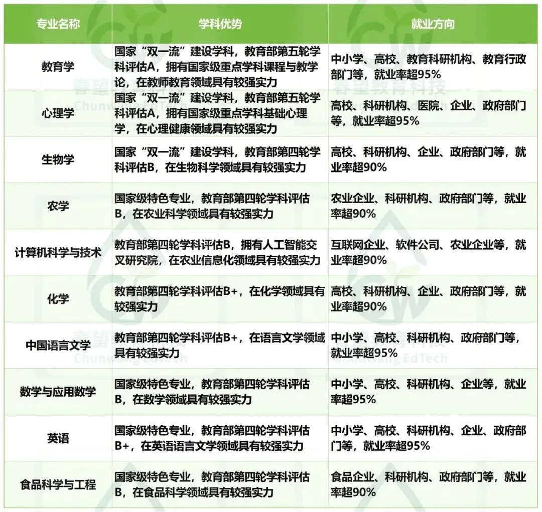 办学特色:西南大学以“含弘光大,继往开来”为校训,形成了“师范+农科”双引擎驱动的办学特色。学校在教育学、心理学、生物学、农学等领域具有较强实力,同时积极布局人工智能、大数据、生物技术等新兴交叉学科,服务国家和地方高质量发展。二、优势专业:师范农科双引擎的学科集群与特色专业