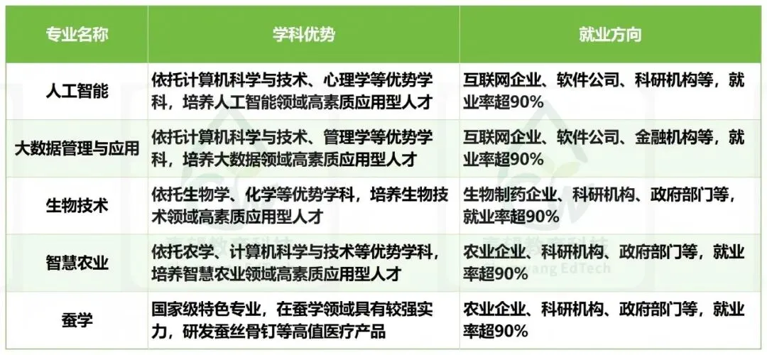 o人工智能、大数据管理与应用、生物技术:依托学校传统优势学科,结合新兴技术,就业前景广阔o智慧农业:依托学校农学、计算机科学与技术等优势学科,培养智慧农业领域高素质应用型人才,就业方向涵盖农业企业、科研机构、政府部门等3. 录取规则提示