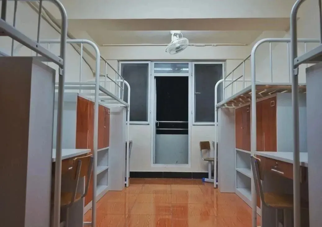 学校宿舍大部分为四人寝,上床下桌。宿舍内有空调(需办理租赁)、电风扇、小阳台,分有房梁寝室和无房梁寝室两种。每层楼共享两个盥洗室与卫生间。每层都设有直饮水机,取热水需要刷校园卡付费。 浴室在1层,为公共浴室,六个水龙头一个隔间,隔间有帘子。
