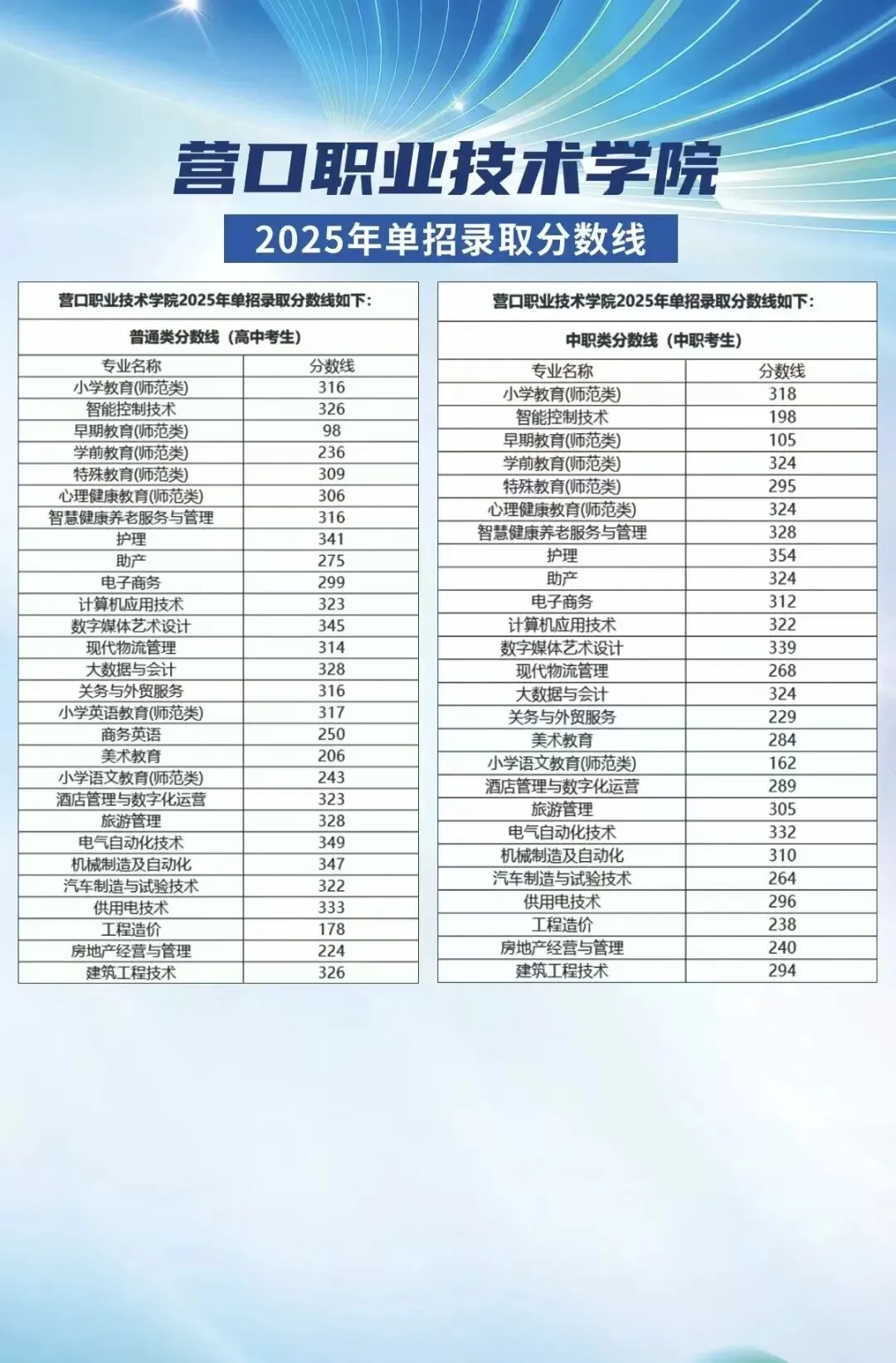 2025年单招营口职业技术学院--各专业录取分数