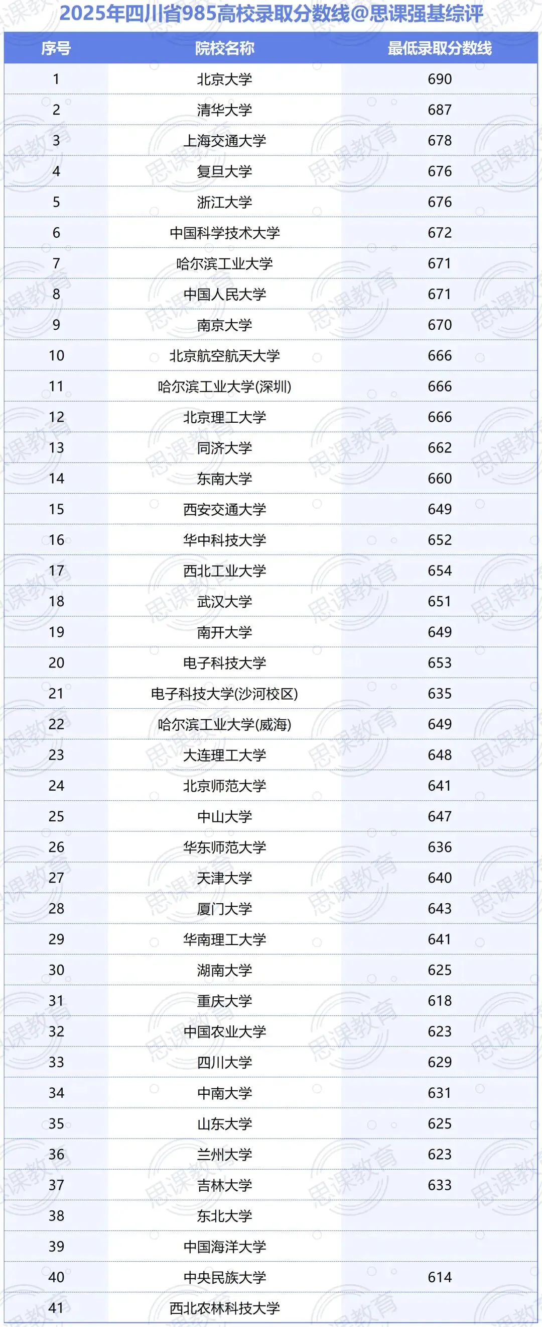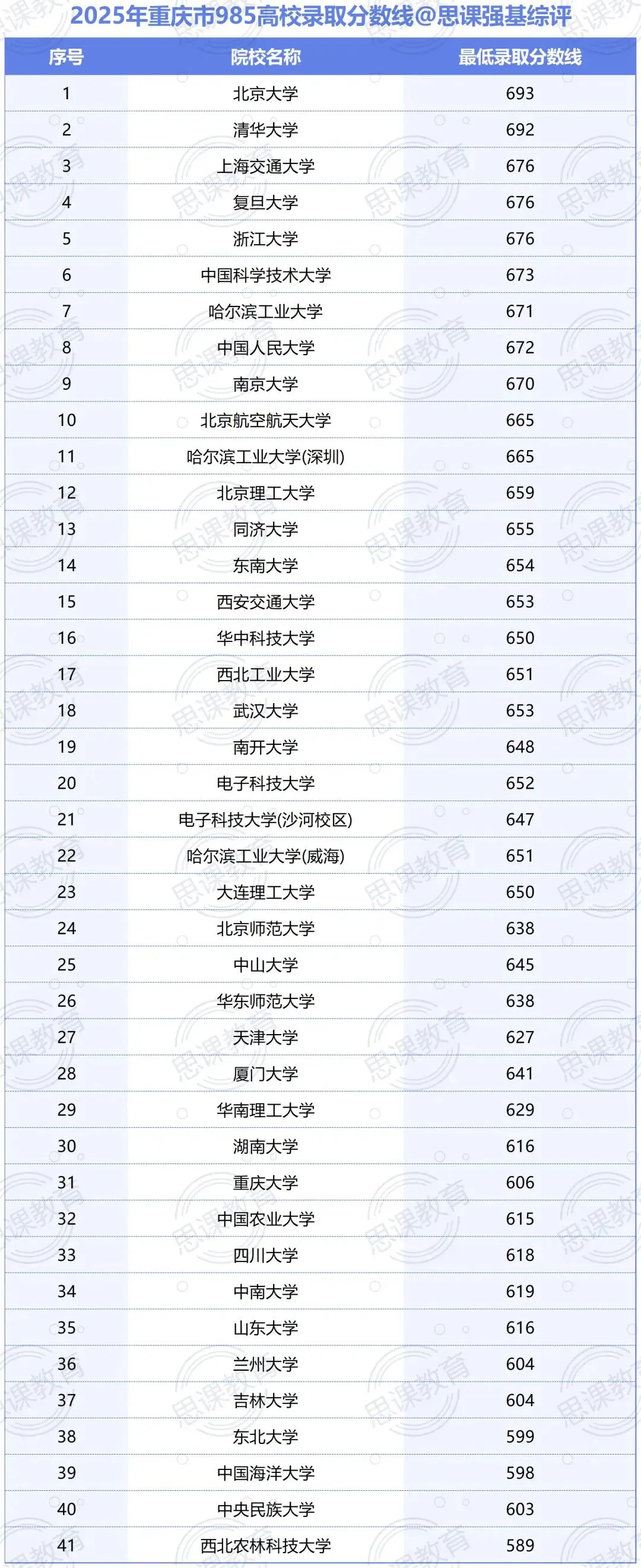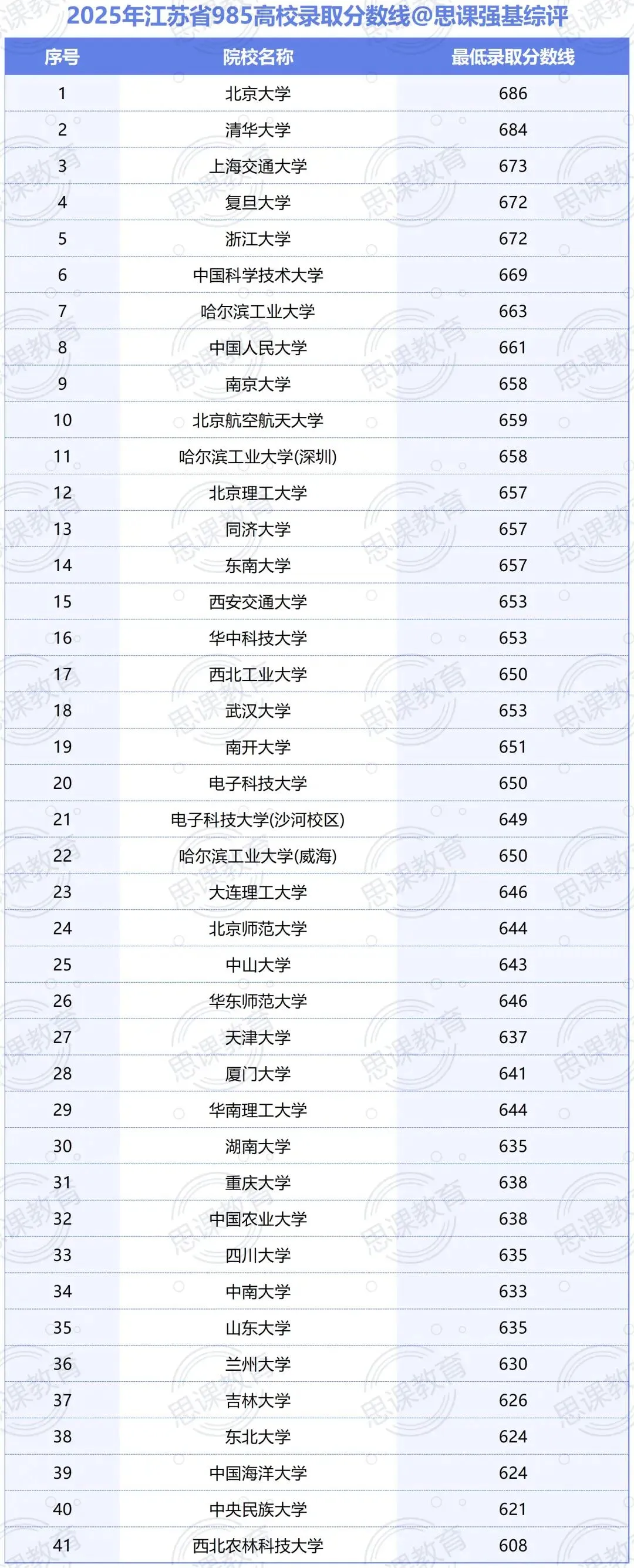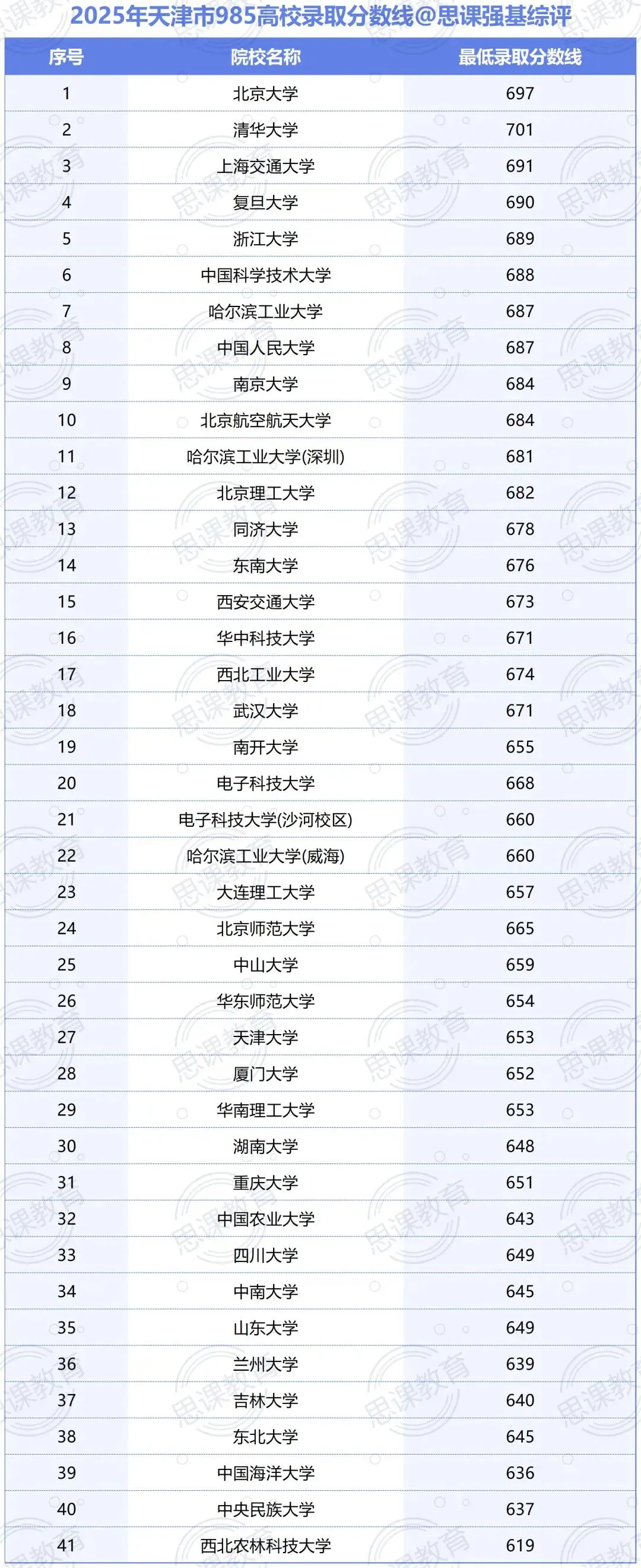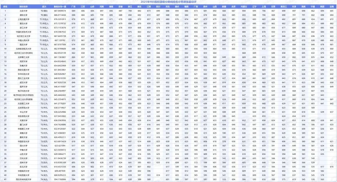 为助力各位考生及家长依据成绩选择目标院校,思课整理了2025年各省市理科版985高校最低录取分数线,并依据数据进行了科学排名,供大家参考!