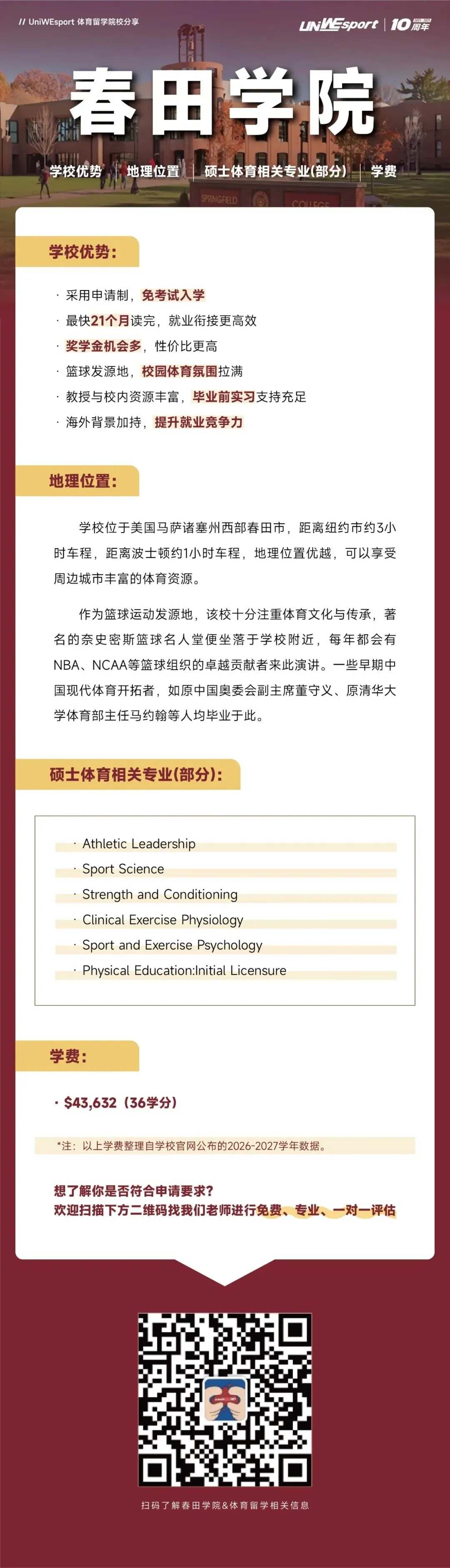 看到这里,如果你对美国春田学院感兴趣或者有任何体育留学相关问题,可以扫描下方二维码,我们的老师会第一时间为你解答。