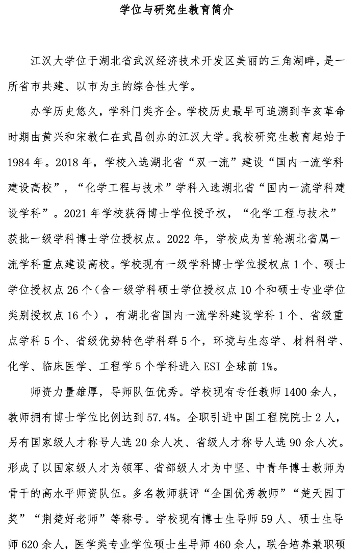 江汉大学是湖北省属综合性大学,实行省市共建、以武汉市为主的管理体制。2001年10月经教育部批准,原江汉大学、华中理工大学汉口分校、武汉教育学院、武汉市职工医学院四校合并组建新的江汉大学。江汉大学合并组建以后,特别是进入新时代以来,始终坚持立足武汉,服务湖北,面向全国,紧紧围绕“在国内有影响、有特色的高水平城市大学”的办学目标定位,坚持以人才培养为中心,聚焦内涵式高质量发展,综合实力和社会影响力不断提升。2018年学校入选湖北省“国内一流学科建设高校”,2021年获批博士学位授予权和省部共建精细爆破国家重点实验室,2022年入选湖北省属高校一流学科重点学科建设高校,是湖北省第一家同时拥有博士学位授予权、国家重点实验室和全职院士的省属高校。