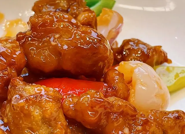 **第二道是荔枝肉。**正宗做法是把肉做成荔枝的样子,现在还有新做法,直接把肉塞进去核的荔枝里再烧制。做出来的荔枝肉口感嫩滑,酸甜可口,特别受欢迎。