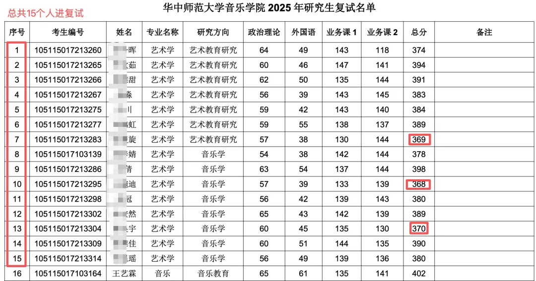14.拟录取人数 | 音乐学6人,艺术教育6人,复试人数15人,筛掉了3人,刷掉了初试最低的3个人368-369-370,由此可见,起码考到380才会比较有戏 |