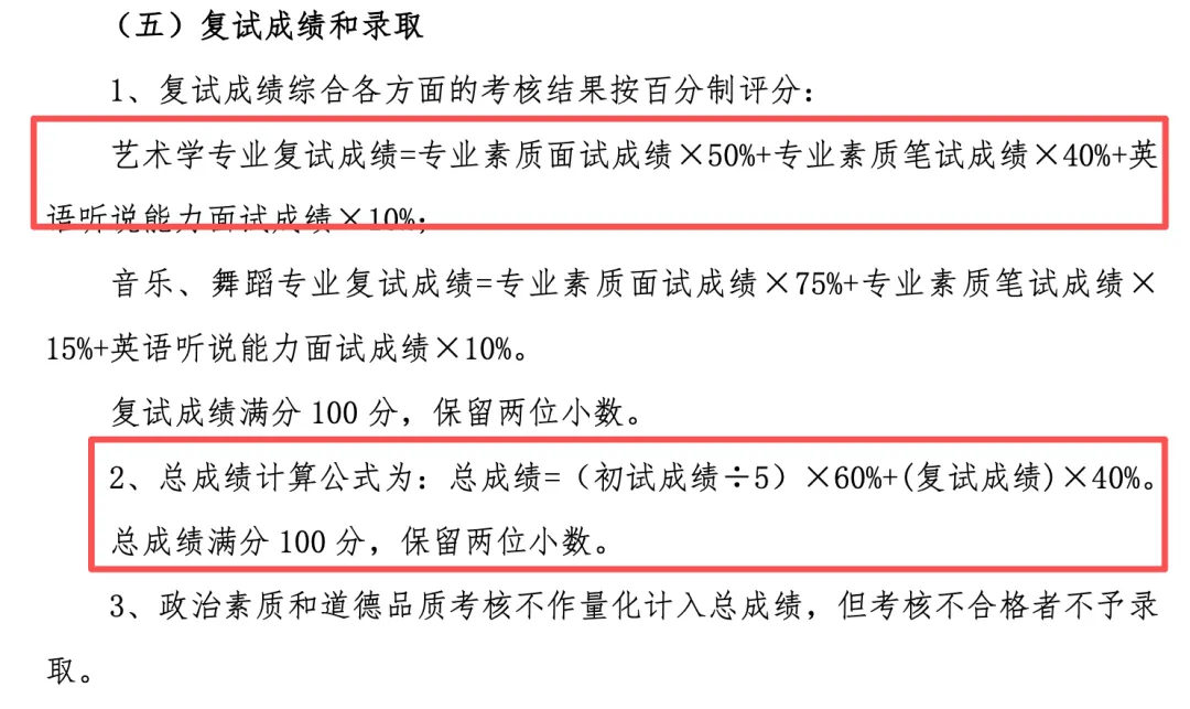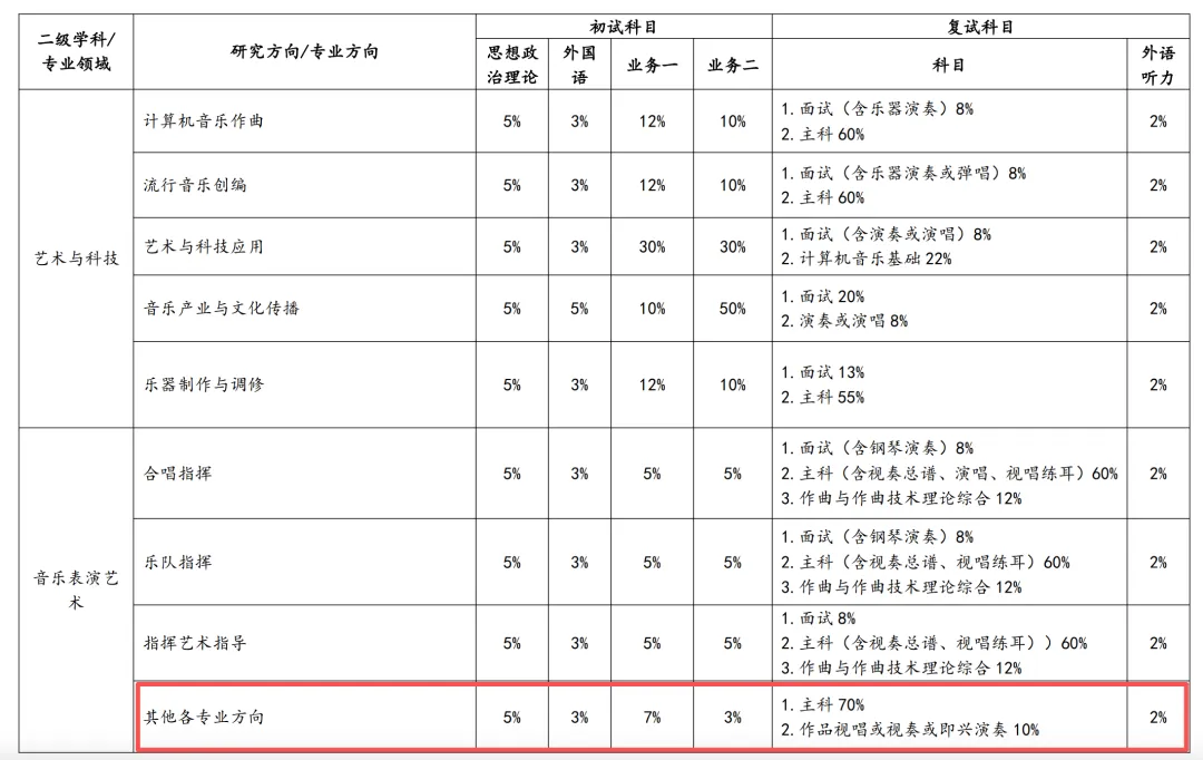 12.复试成绩算法 | 初试:政治5%、英语3%、音乐史7%、和声曲式3% 复试:主科70%、作品视唱或视奏或即兴演奏10%、英语听力2% |