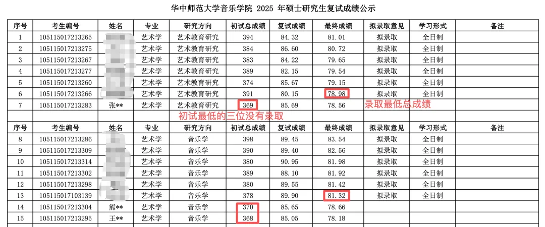 初试第一名398,果然还是综合成绩第一名, 艺术教育最低录取成绩78.98,音乐学最低录取成绩81.32