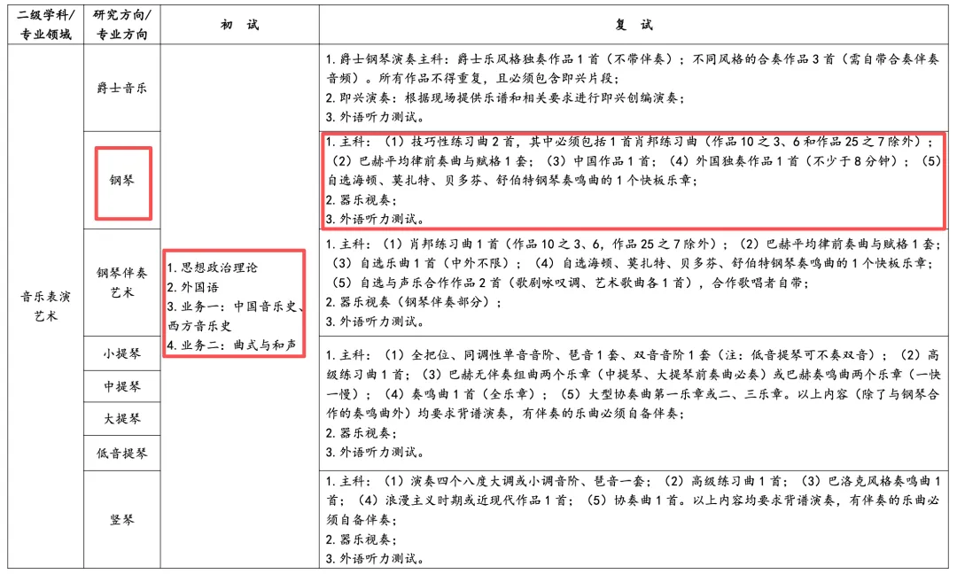 (1)肖邦练习曲1首(作品10之3、6,作品25之7除外);(2)巴赫平均律前奏曲与赋格1套;(3)自选乐曲1首(中外不限);(4)自选海顿、莫扎特、贝多芬、舒伯特钢琴奏鸣曲的1个快板乐章;(5)自选与声乐合作作品2首(歌剧咏叹调、艺术歌曲各1首),合作歌唱者自带;