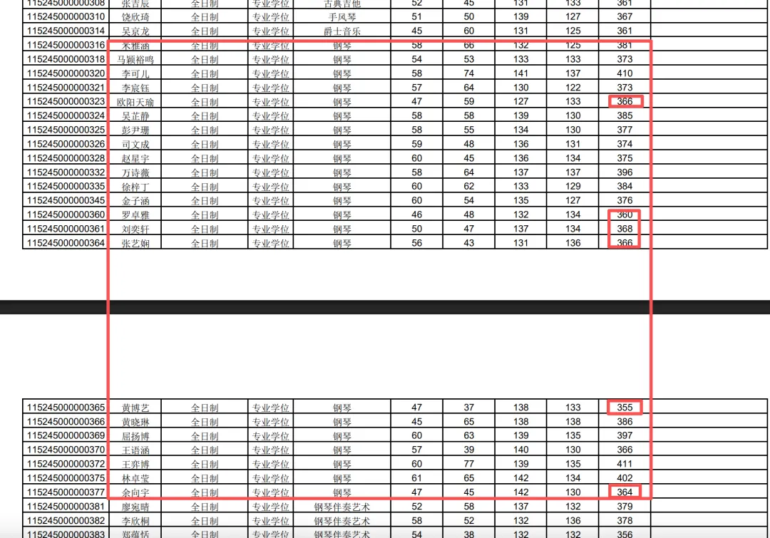 钢琴演奏进了22个人,艺术指导27个人,,钢琴系预分名额32个人,进了49个人,多了17个人,大概是1:1.5的进复试率,最低分351的都有,350-360的也有不少,过了国家线就可以进复试