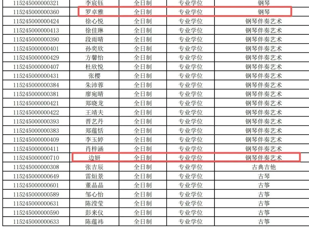 拟录取名单对照复试成绩单,钢琴演奏录取到罗卓雅同学,艺术指导录取到边妍同学