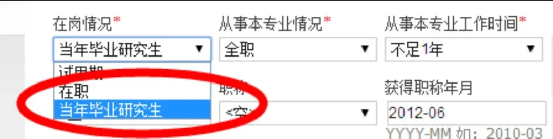 l需要注意获取职称年月的格式 YYYY-MM 如 2008-03。l在岗情况一项中,以研究生学历报考的考生应注意,若本人为当年毕业研究生,尚未获取毕业证书,此处需要选择为“当年毕业研究生”。-若用户获取有职务,职称等信息请予以准确填写,这将有利于为您提供更加详尽的成绩分析服务。4. 教育经历和培训经历