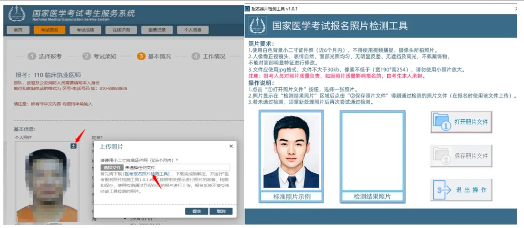 2021年起,考生网上报名前,先按要求准备近期(6个月内)小2寸白底证件照,文件小于30kb,格式为jpg。报名上传照片前须通过「医考报名照片检测工具」(下载地址在上传照片界面处提示,如下图)进行检测处理。检测过程请严格按页面说明操作,检测通过后保存,登陆国家医学考试考生服务系统报名时上传,报名系统不接受未经该工具检测的照片。请广大考生提前准备,以免影响考试报名。注意:个别使用旧照片时,经检测工具检测后会超30K的情况,请用微软自带的画图软件打开,不做任何操作,直接保存后查看其真实文件大小,适当按比例缩小后再用检测工具检测,直到保存后的文件大小小于30K。